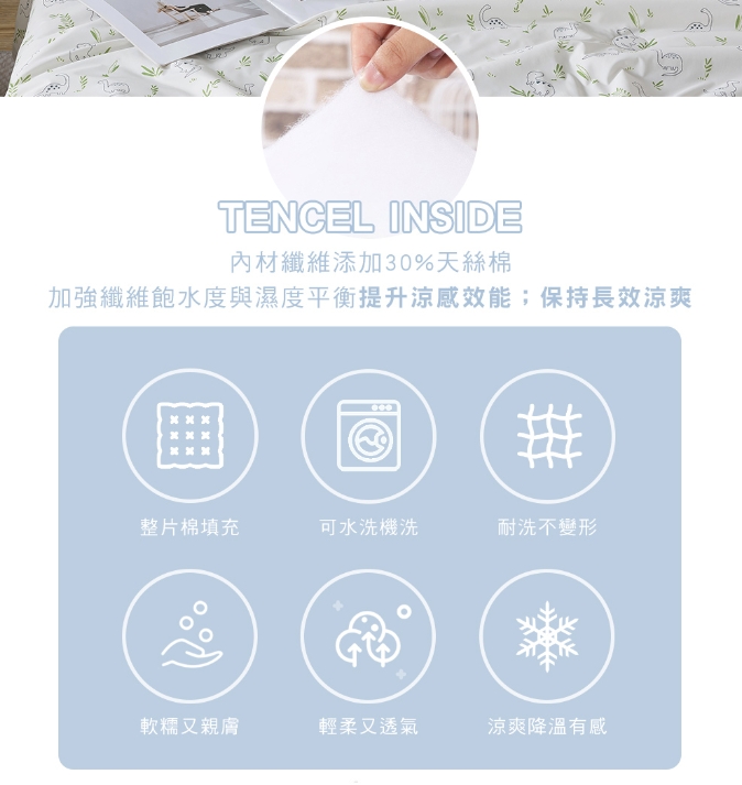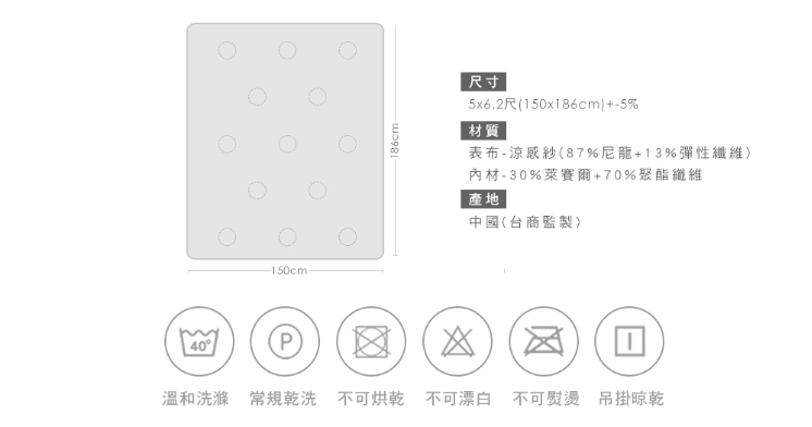 材質:表布-涼感紗(87%尼龍+13%彈性纖維)/填充物-30%萊賽爾+70%聚酯纖維