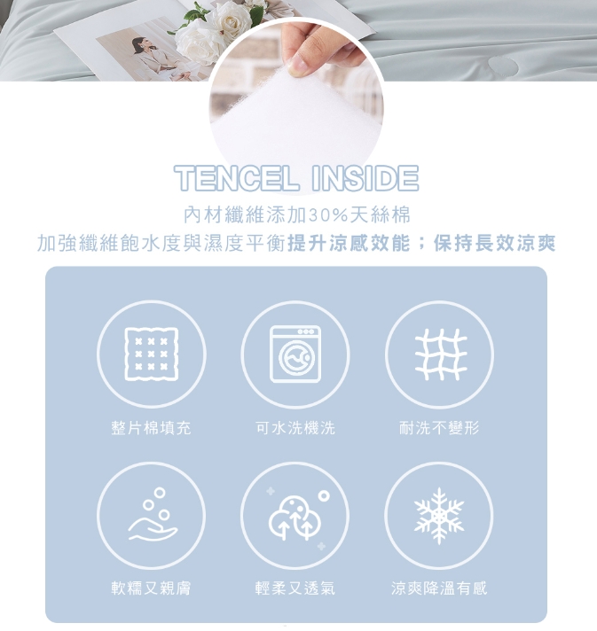 材質:表布-涼感紗(87%尼龍+13%彈性纖維)/填充物-30%萊賽爾+70%聚酯纖維