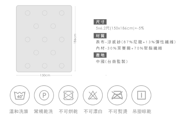 材質:表布-涼感紗(87%尼龍+13%彈性纖維)/填充物-30%萊賽爾+70%聚酯纖維